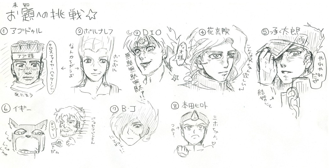 夕食+風呂に入った後はお絵かきをしました。2人でジョジョお題を出し合い記憶だけで描いたのが左のやつです。上が電子で下がトミー。